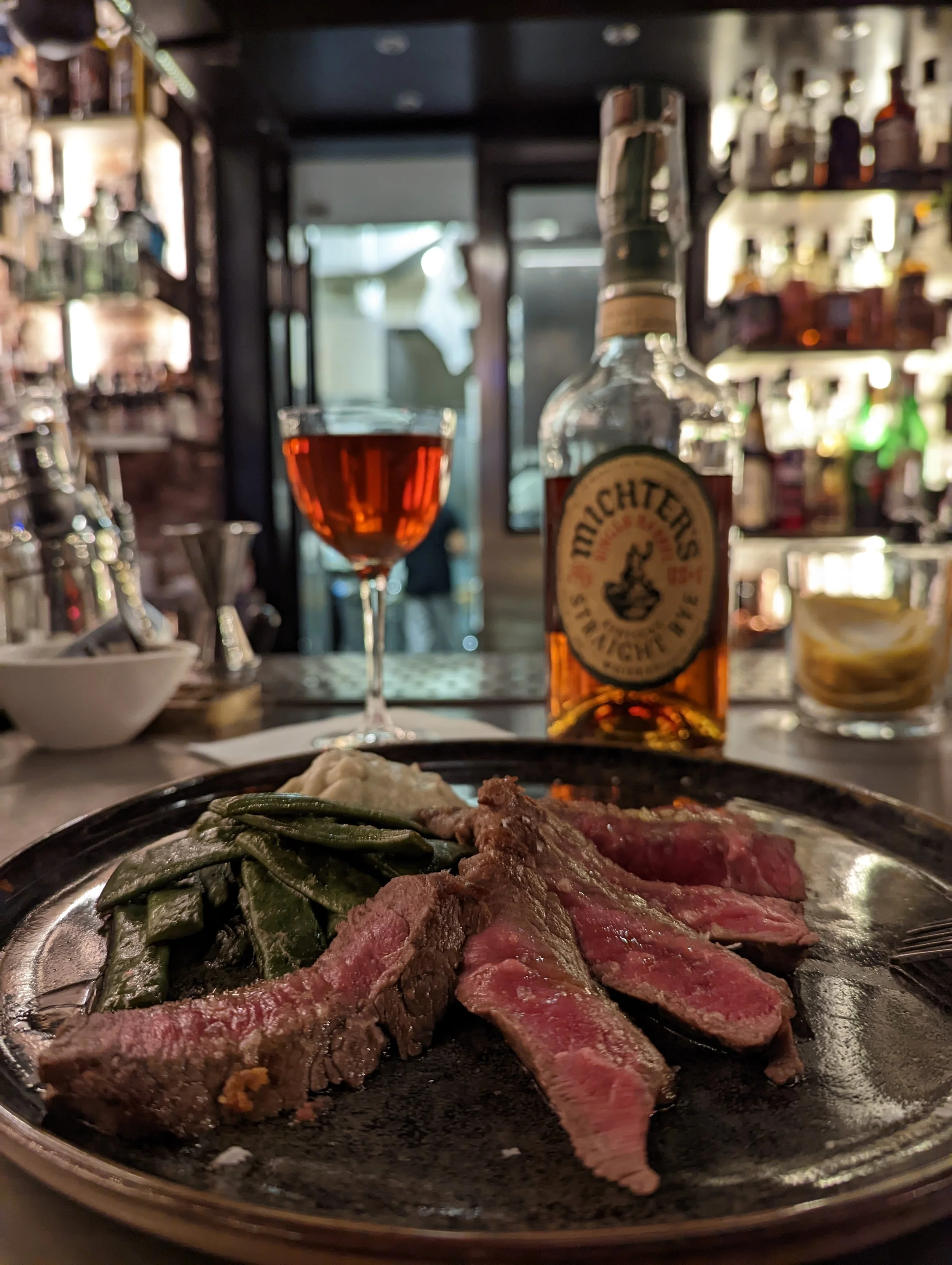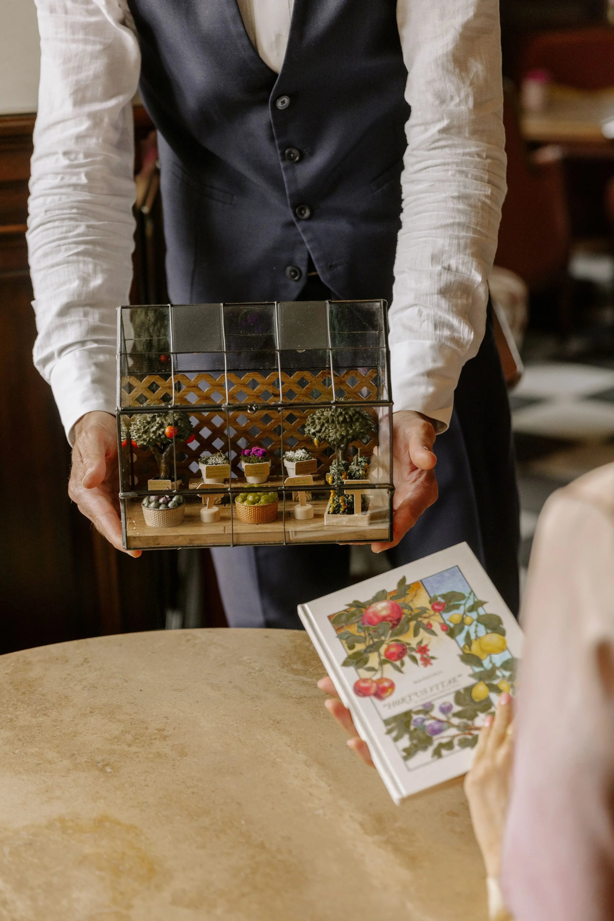 The Hortus Vitae physical menu itself is environmentally concious, made with coffee grounds, citrus peels, and recycled paper. The menu is presented next to a mini-display greenhouse showcasing some of Simone’s protagonist ingredients featured in the cocktails. One such plant is chamomile, featured as a homemade liqueur in Flora’s Harmony alongside fresh elderflower syrup, lemon juice and Farmer’s gin.